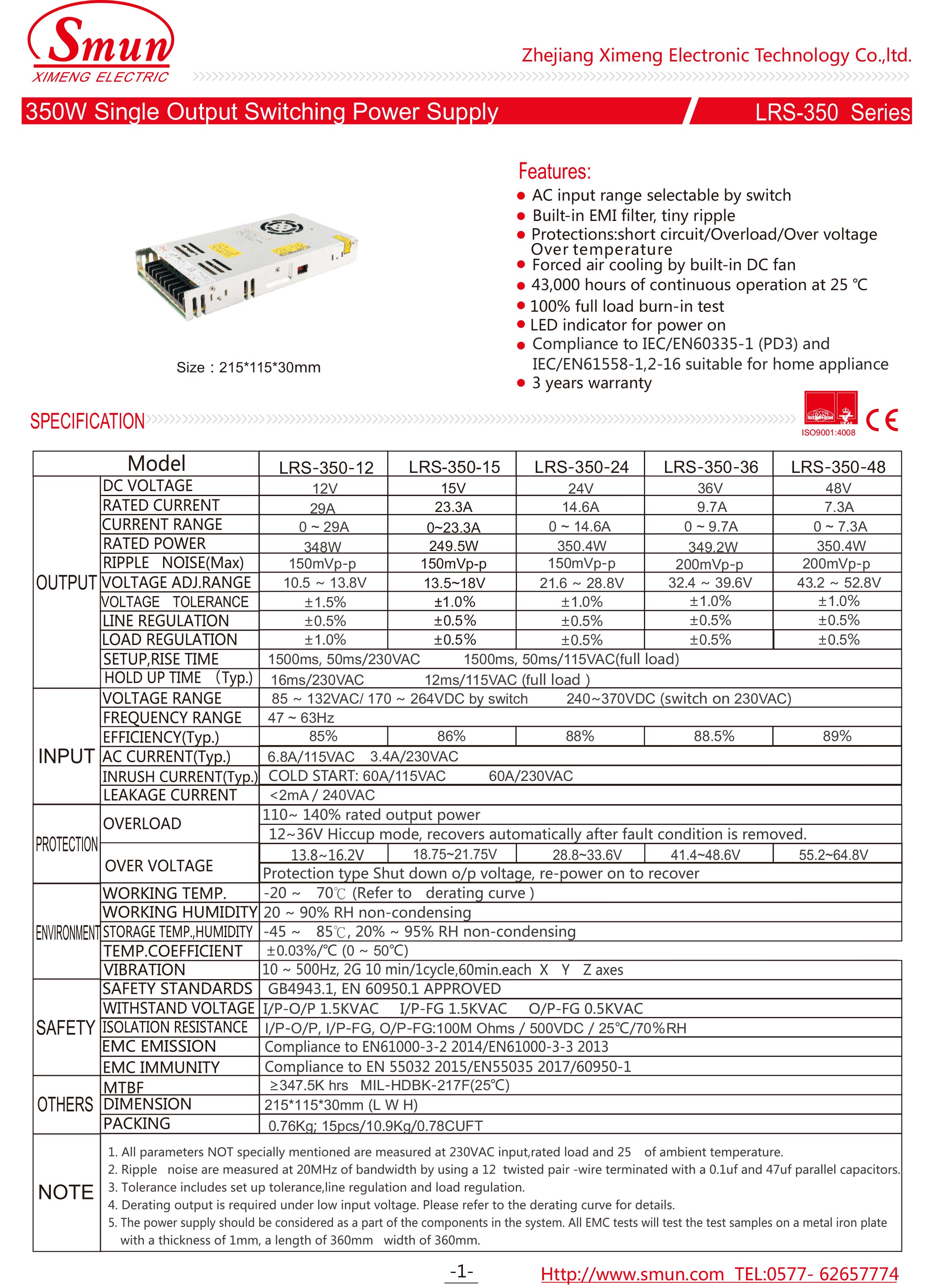 LRS-350 시리즈는 30mm 로우 프로파일 디자인의 350W 단일 출력 밀폐형 전원 공급 장치입니다. 115VAC 또는 230VAC(스위치로 선택 가능)의 입력을 채택하여 전체 시리즈는 12V, 15V, 24V, 36V의 출력 전압 라인을 제공합니다. 및 48V.