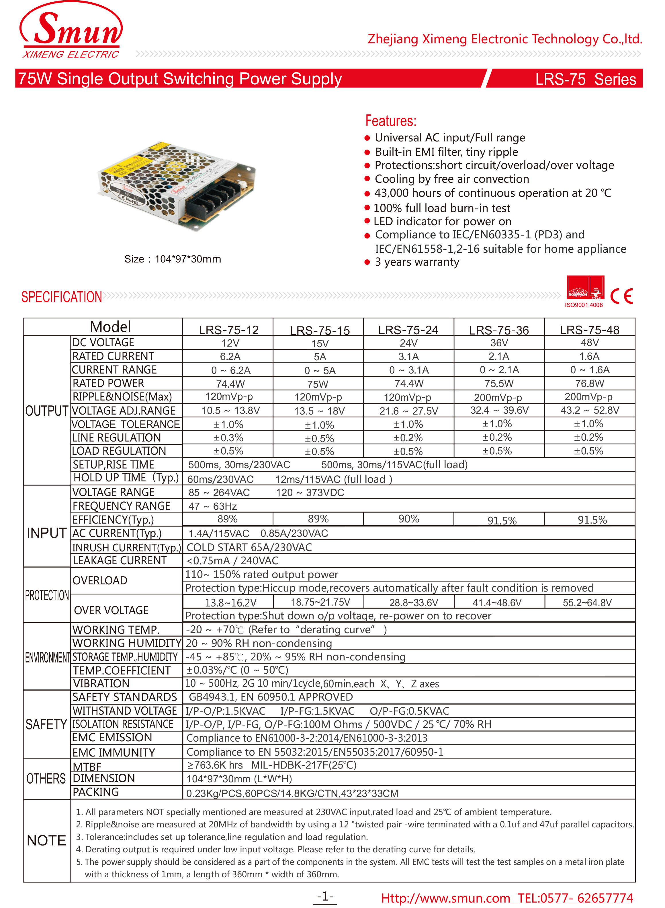 LRS-75 시리즈는 30mm 로우 프로파일 디자인의 75W 단일 출력 밀폐형 전원 공급 장치입니다. 전체 범위 85-264VAC 입력을 채택하여 전체 시리즈는 5V, 12V, 15V, 24V, 36V 및 48V의 출력 전압 라인을 제공합니다. .